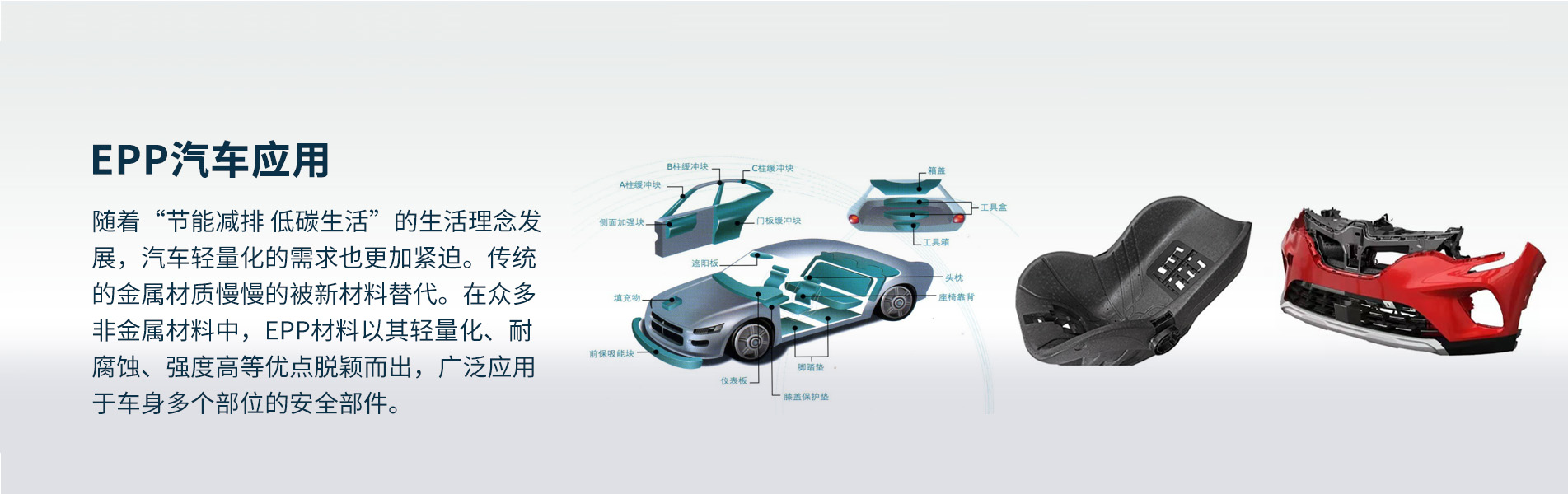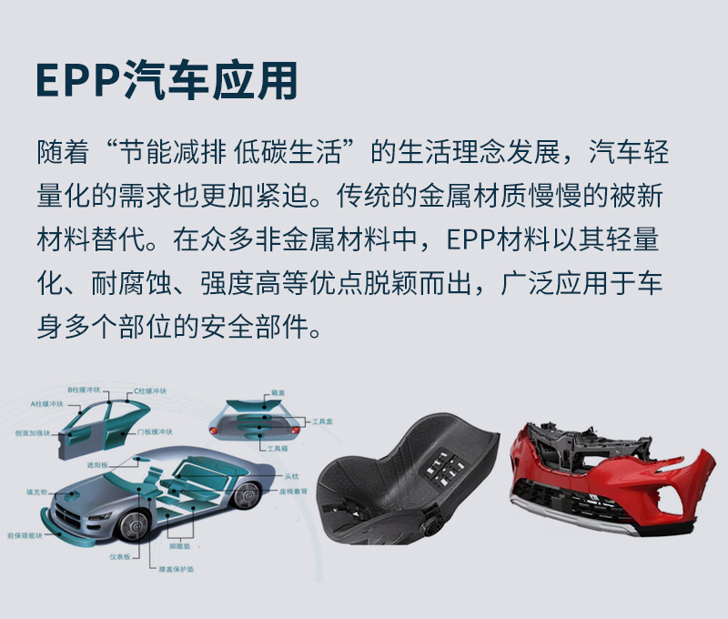 EPP材料的輕質特性(xìng)使其成為汽車製造領域的理想選擇。在(zài)汽車(chē)構件中使用EPP可以降(jiàng)低車身重量,提高燃油效率,並減少碳(tàn)排放量,有助於實現更環保的交通運輸(shū)。